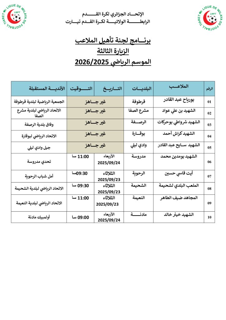 بناءا على مراسلة اللجنة الوطنية التقنية المؤقتة لمراقبة الملاعب للاتحاد الجزائري لكرة القدم و الخاصة بالمعاينة الثالثة للملاعب تعلن الرابطة الولائية عن برنامج الزيارات وفق الجدول الأتي :